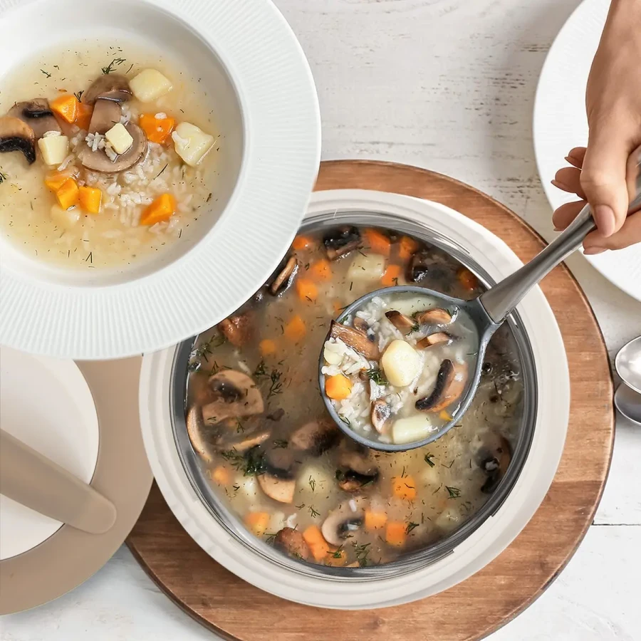 Nerezové vnútro a plastový obal zaisťujú výbornú izoláciu, vďaka ktorej jedlá zostanú chutné a v správnej teplote – či už ide o horúce polievky, rizotá, pečené mäso alebo chladené šaláty a dezerty.